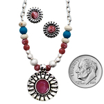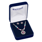 Bring the beauty of desert blooms to your collection with the Desert Flower Jewelry Set. The set features a necklace pendant with a 20-inch adjustable chain, and earrings with hypoallergenic post backs. Each piece showcases vibrant purple and turquoise stones framed in a sunburst-style design. Stone color may vary.