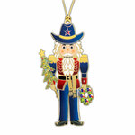 If you love nutcrackers and Texas, this ornament is for you. This traditional nutcracker celebrates Texas from his hat all the way down to his iconic boots. The ornament is finished with a holiday tree and a wreath showcasing the Texas flag. Proudly made in the USA, this is a must have item for anyone that loves Texas.<br><br>4" x 2"